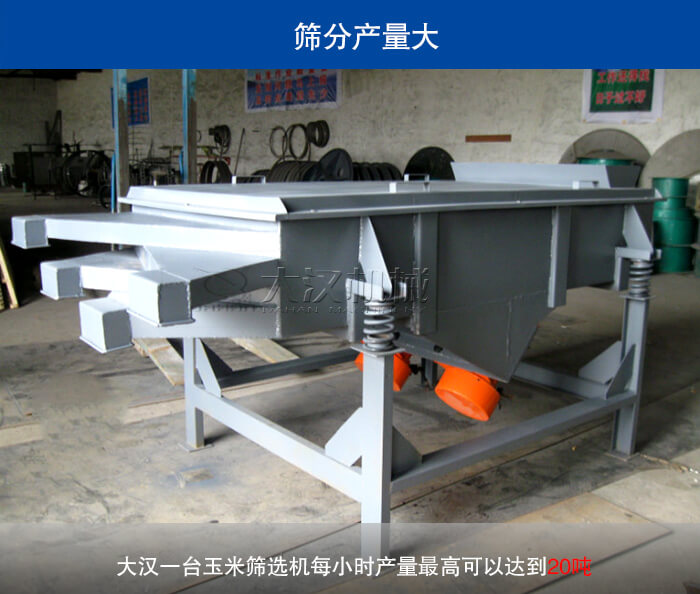 針對(duì)玉米篩選行業(yè)而言,對(duì)我們篩選機(jī)的產(chǎn)量是有要求的,大漢生產(chǎn)的玉米篩選機(jī)采用雙電機(jī)驅(qū)動(dòng),設(shè)備激振力大,而且我們的玉米篩選機(jī)加裝分料器,能有效的利用直線振動(dòng)篩篩面面積,能使物料均勻分布在篩面上,大大提升物料篩分精度與蟬聯(lián),據(jù)實(shí)驗(yàn)證明,大漢一臺(tái)玉米篩選機(jī)每小時(shí)產(chǎn)量高可以達(dá)到20噸。