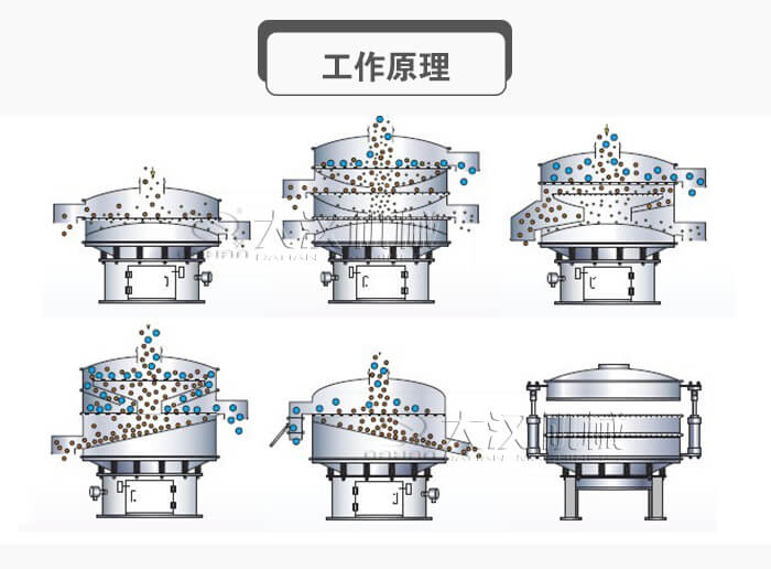 它是以直立式電機(jī)作激振源,通過(guò)調(diào)節(jié)電機(jī)上、下兩端安裝有偏心重錘,可將電機(jī)的旋轉(zhuǎn)運(yùn)動(dòng)轉(zhuǎn)變?yōu)樗?、垂直、傾斜的三次元運(yùn)動(dòng),然后再把這個(gè)運(yùn)動(dòng)傳遞給篩面,使篩面上的物料做外擴(kuò)漸開(kāi)線運(yùn)動(dòng),從而實(shí)現(xiàn)對(duì)粉狀物料進(jìn)行精篩分、概率篩分等。