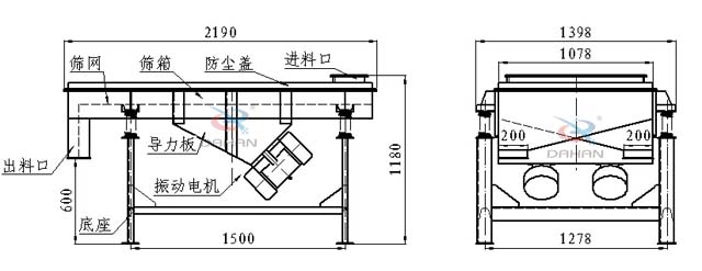 7、支架:由四個支柱和兩個槽鋼組成,支持著篩箱,安裝時支柱必須垂直與地面,兩支柱下面的槽鋼應相互平行。